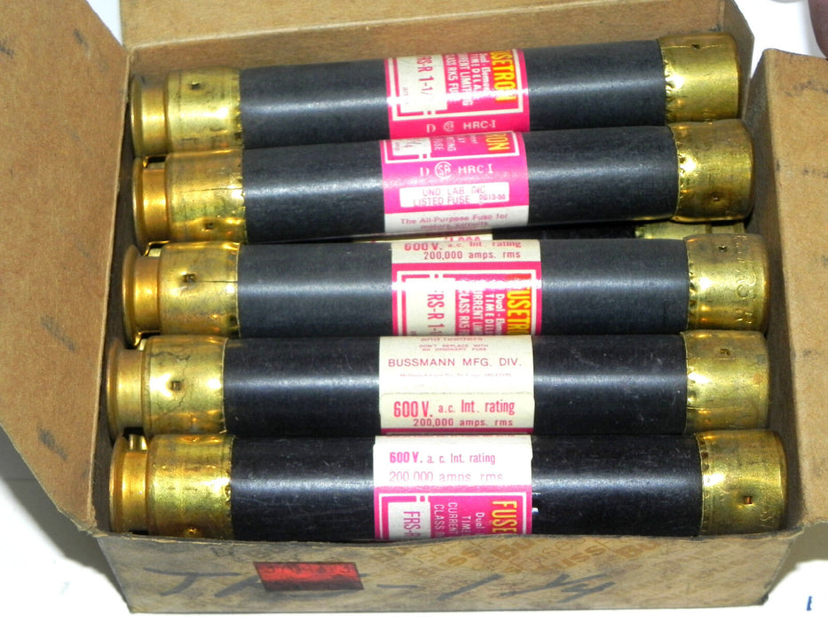 BOX OF 10 BUSSMANN FUSETRON FRS-R-1-1/4 FUSES 1.25AMP 600V CLASS RK5 TIME DELAY